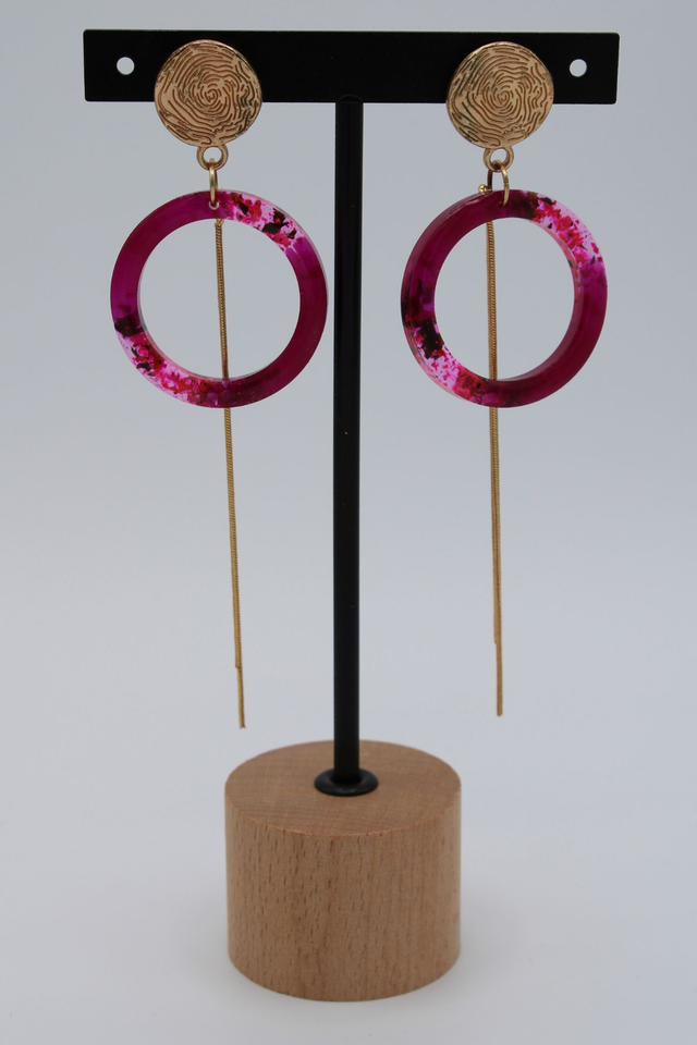 Chaque paire raconte une histoire. Le clou doré, gravé d’un motif empreinte, symbolise l’unicité de chaque être. Suspendu à lui, un anneau marbré aux nuances de rose et de violet, comme un ciel au crépuscule, laisse passer une fine tige dorée qui trace une ligne d’élégance. Ces boucles dansent entre douceur et audace, entre transparence et lumière.