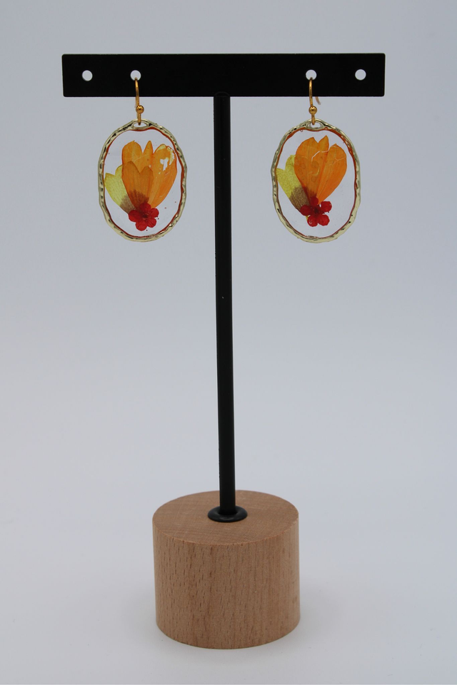 Laissez-vous séduire par l’élégance naturelle de ces boucles d’oreilles faites main. Chaque paire est une célébration de la beauté végétale, composée de véritables pétales pressés aux teintes chaudes — orange, jaune et rouge — soigneusement disposés dans un cadre ovale doré. Un petit bouton de fleur rouge vient ponctuer la composition avec délicatesse. Ces bijoux poétiques apportent une touche bohème et romantique à votre tenue, tout en affirmant votre goût pour l’artisanat et l’authenticité.