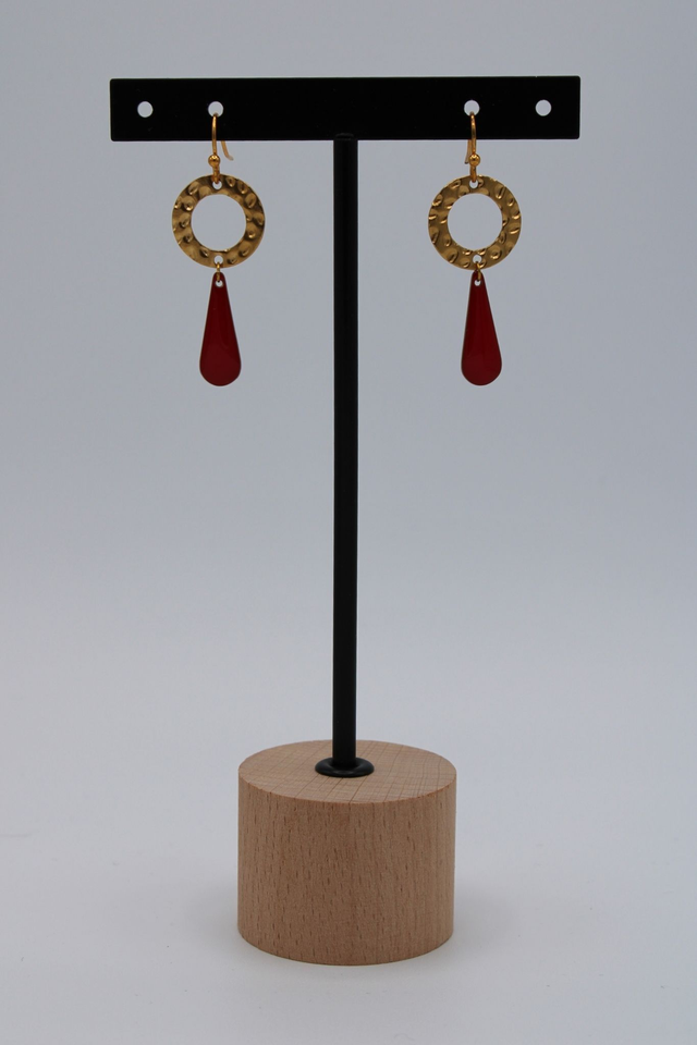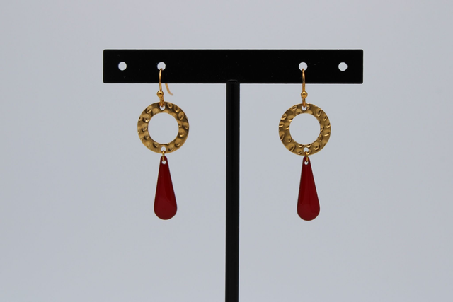 Ces boucles d’oreilles associent l’éclat d’un anneau doré texturé à la profondeur d’une goutte rouge intense. Leur design épuré mais vibrant évoque la chaleur d’un coucher de soleil et la force d’une féminité affirmée. Élégantes et audacieuses, elles illuminent le visage avec caractère.