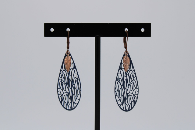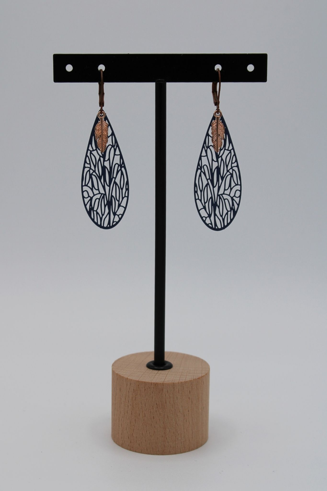 Ces boucles d’oreilles en forme de goutte arborent un motif ajouré évoquant les nervures d’une feuille ou les courbes de la nature. Leur teinte bleu nuit contraste avec le petit pendentif feuille cuivré, apportant une touche chaleureuse et organique. Élégantes et poétiques, elles célèbrent la beauté sauvage dans un écrin raffiné.